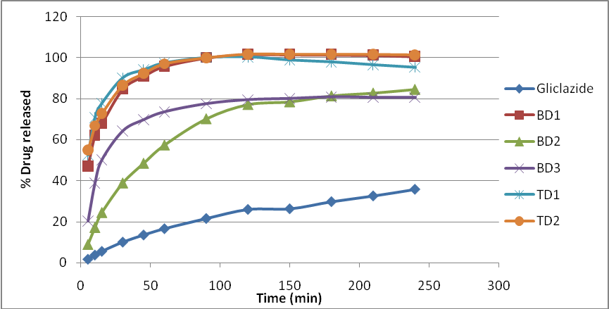 A physical mixture of binary and ternary systems also provide increased dissolution rate compared to pure gliclazide can occur because when the physical mixture was added to the dissolution medium carrier will dissolve over time so will alter the hydrophilicity/lipophilicity or wetting of active substances that will enhance the dissolution. Another mechanism was a weak complex formation of the carrier with the active substance on the surface of the particles so that it will produce greater dissolution rate [12].
