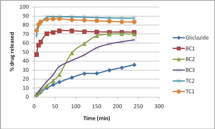 Statistical analysis ƒ2 for pure gliclazide with BC1, BC2, BC3, TC1 and TC2, BC1 to BC2, BC3, TC1 and TC2, TC1 and TC2 BC3 with the obtained results<50. These results give meaning between the dissolution rate of a physical mixture of the above is no Similar, Similar dissolution rate were obtained between a physical mixture of BC2 to BC3 danTC1 comparison with the value TC2 54.55 and 70.65. For statistical analysis ƒ2 BC2 with TC1 and TC2 cannot be done because RSD for BC2 on the first point>20% while for the point of the 2nd, 3rd and 4th of>10%.
