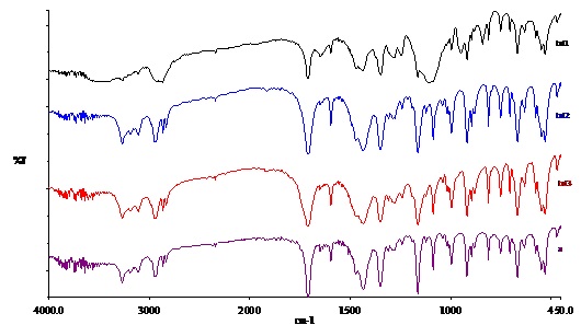 Fig. 6: FTIR spectra of pure drug (a), BD3, BD2, and BD1 (from bottom to top)