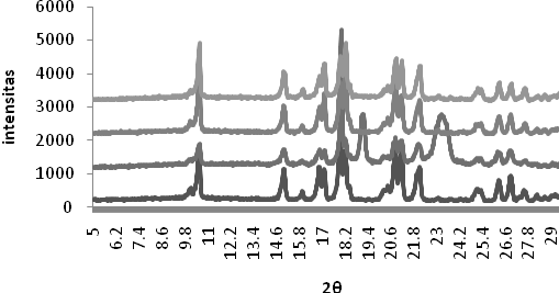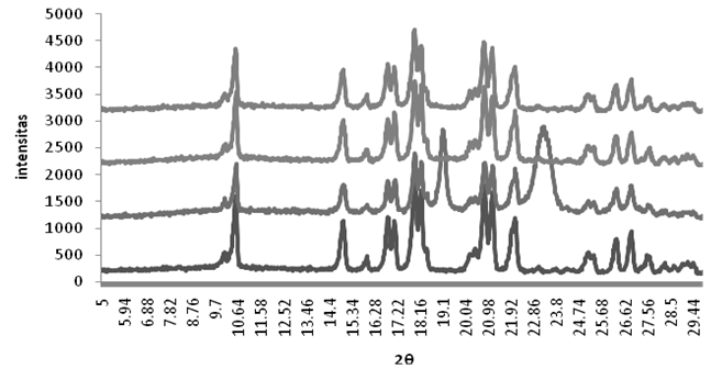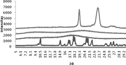 Fig. 10: X-ray diffraction pattern of gliclazide, Eudragit®E100, HPMC, and poloxamer 188 (from bottom to top)