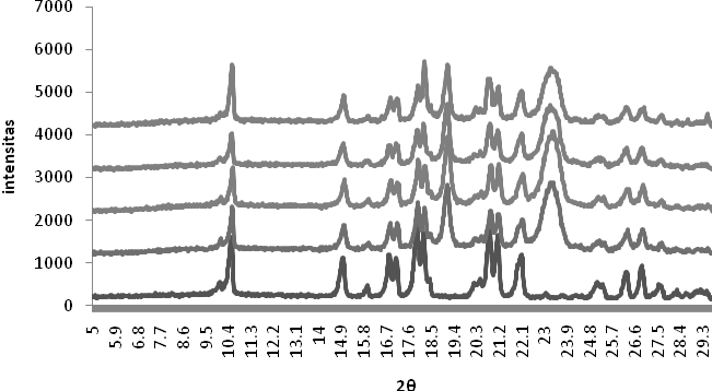 Fig. 13: X-ray diffraction patterns of pure gliclazide, TD1, TD2, TC1, and TC2 (from bottom to top)