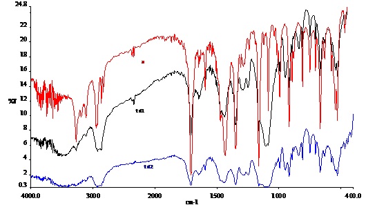 Fig. 8: FTIR spectra of pure drug (a), TD1, and TD 2 (from top to bottom)