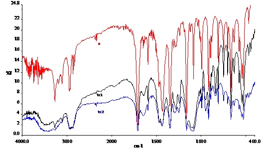 Fig. 9: FTIR spectra of pure drug (a), TC1, and TC2 (from top to bottom)