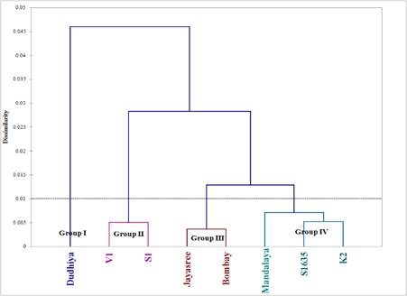 Fig. 1: Dendrogram cluster analysis of eight mulberry cultivars