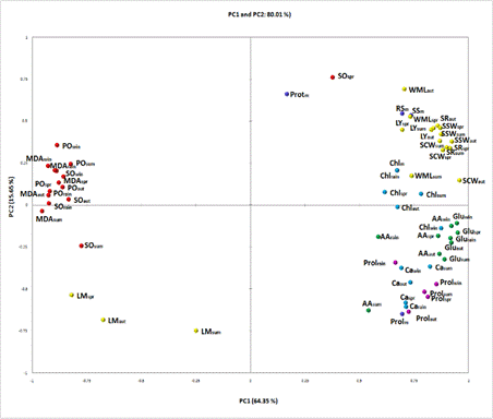 Principal components analysis (PCA) is used mainly to condense dimensionally the multiple features to two or three dimensions. PCA helps to summarize the variation of correlated multi-attribute with respect to the uncorrelated components set; each has a meticulous linear combination of the original variables. From this PCA analysis (fig. 2) it was found that all economic attributes of the silkworm rearing system at different season formed a clustering pattern. It was also revealed that commercial attributes were influenced by chlorophyll, protein, reducing sugar and total soluble sugar content of young and mature mulberry leaves. On the other hand, free radical scavengers like ascorbic acid, glutathione (non-enzymatic antioxidant member), carotenoids and chlorophyll (pigment member) formed another cluster. ROS such as lipid peroxidation member (H2O2, MDA, superoxide, and proline content) occupied the third cluster on this PCA plot. The lipid peroxidation cluster had a negative impact on economic attributes of the rearing system. This PCA analysis helped to visualize our results.