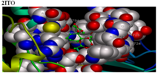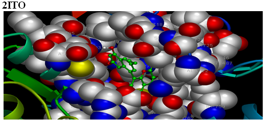 Among all the drugs 2ITO showed its effectiveness in binding with selected cancer target proteins. The results of the present in silico study support the interaction of protein-ligand that is binding and interaction of ligands (N. arbor-tristis) with inflammatory and cancer targets will be predicted by using these molecular docking studies. Similar to the present studies Radhakrishnan and Ismail (2015) [8] analyzed the in silico experiments and identified the cosmetic potential of Southeast Asian herbs. The bioassay-guided isolation of mosquito larvicidal compound from the acetone leaf extract of Elaeagnus indica Bull was evaluated and its detailed in silico study was reported [9]. Certain important compounds were isolated from medicinal plants and extensively studied their properties against inflammatory arthritis and regulatory effects of glucose and triglycerides in mice (Mus musculus) [10, 11]. The phytochemical and pharmacological potential ethanolic extracts of Nyctanthes arbor-tristis were investigatedthrough in silico experimentations, and their clear potentials on diabetes and cancer were proved [12-14]. In another study [15] the parameter for the identification of weak binding chemical entities, are illustrated with the discovery of a new lead compound for NF-kappaB. Further biochemical analyzes based on EMSA were performed, and biological effects were tested on the compound exhibiting the best docking score. All experimental analysis was in fairly good agreement with molecular modeling findings. In another study [16] they isolated two compounds Of the two compounds, taraxerol showed the greatest inhibition of GSK-3 protein in molecular docking and dynamics studies. As it showed minimum binding (−12.59 kJ mol−1) and docking (−11.25 kJ mol−1) energy with an acceptable affinity towards the active pocket, taraxerol can be considered a good inhibitor of GSK-3.