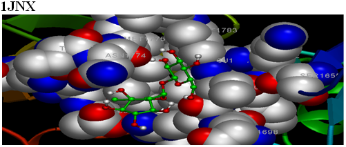 The main chemical compound 7-ethyl-3a, 7a-dihydroxy-3-(2,3,4,5,6-pentahydroxycyclohexyloxy) tetrahydro-2H-furo[3,2-c] pyran-6(3H)-one (381 (C15H24O11)) obtained from N. arbor-tristis stem was docked against three receptors (1CX2, 1JNX and 2ITO) and analyzed for their binding energy values. The glycoside compound obtained from DSM showed highest binding energy of-5.73 kcal/mol at 10th run against 2ITO receptor protein followed by 1JNX with-4.35 kcal/mol and with 1CX2-3.45 kcal/mol. As shown in table 3 these ligands interacted at different sites in model proteins and visualized the docked complex in fig. 3 and table 3.