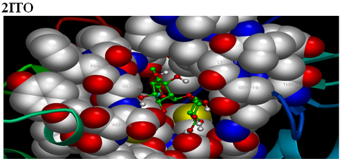 Was docked against three receptors (1CX2, 1JNX and 2ITO) and analyzed for binding energy values. The glycoside obtained from DLM showed highest binding energy of-2.43 kcal/mol at 10th run against 1JNX receptor protein followed by 2ITO with-2.24 kcal/mol and 1CX2 with-1.67 kcal/mol. As shown in table 1 these ligands interact at different sites in modeled proteins and visualized the docked complex in fig. 1 and table 1.