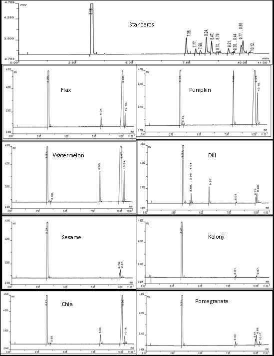 Watermelon seed was found to contain myristic acid, palmitic acid, linoleic acid and linolenic acid corresponding to peaks obtained at tR 3.56, 8.03, 9.97 and 10.24 respectively. Dill seed was found to contain myristic acid, pentadecanoic acid, palmitic acid, linoleic acid, stearic acid, hexadecanoic acid and linolenic acid corresponding to peaks obtained at tR 3.86, 3.96, 4.04, 5.57, 8.01, 9.79 and 9.89 respectively. Sesame seed was found to contain stearic and oleic acid corresponding to peaks obtained at tR 9.79 and 9.87 respectively.Kalonji seed was found to contain palmitic acid and oleic acid corresponding to peaks obtained at tR 8.01 and 9.87 respectively. Chia seed was found to contain myristic acid, palmitic acid, linoleic acid and linolenic acid corresponding to peaks obtained at tR 3.55, 8.00, 9.96 and 10.18 respectively. Pomegranate seed was found to contain palmitic acid, stearic acid, oleic acid, linoleic acid, punicic acid and linolenic acid corresponding to peaks obtained at tR 8.02, 9.81, 9.89, 10.17, 11.53 and 11.66 respectively. A peak at tR 3.18-3.21 is corresponding to n-hexane which is used as a solvent for fixed oil.