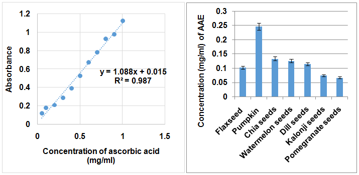 Total phenolic content (TPC) was presented in terms of ascorbic acid equivalent (AAE). Absorption was measured at 756 nm. Fig. 4 (i) shows the standard curve for ascorbic acid and (ii) shows the AAE concentration of phenolic in seed extracts among which pumpkin seeds showed the highest value. Order of concentration of TPC was as follows: