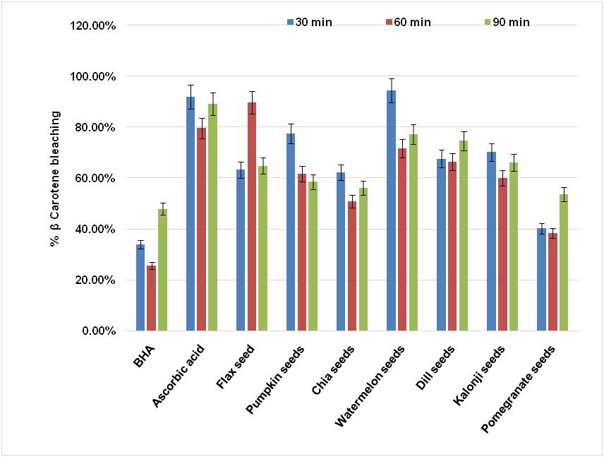 Results: Pumpkin seeds showed highest phenolic content and highest DPPH radical scavenging activity. Chia seeds showed highest ferric reducing capacity for FRAP and ferric-ferrozine assay. All seed sample showed higher β-carotene bleaching than synthetic antioxidant BHA.