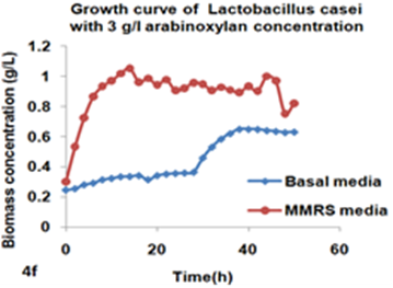 Fig. 4a through 4c and 4d through 4f depict the time trajectories of biomass concentration in MMRS and Basal media over the culture period of 56 h have been plotted in fig. 4a-4c and 4d-4f respectively for glucose and arabinoxylan varying their initial concentrations in the range of 1-3 g/l.
