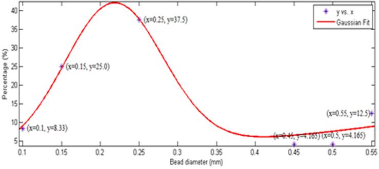 24 freshly prepared microcapsules were selected randomly and their sizes were examined under a microscope. From the microscopic analysis, it has been observed that the size of the microcapsules varies from 0.1 mm to 0.55 mm in which 0.25 mm of diameter size microcapsules were maximum i.e., 38% of total microcapsules. The bead size distribution has been presented in fig. 8.