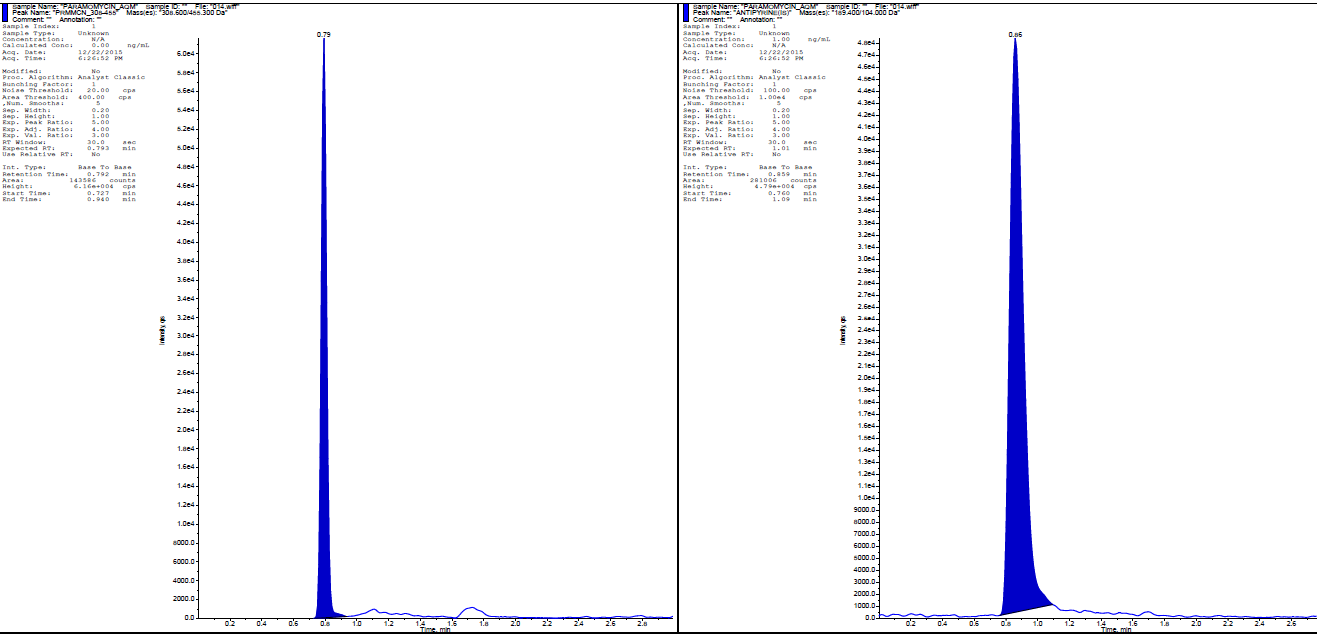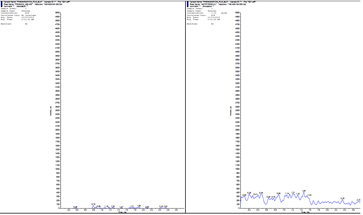 Two criteria were used to define LOQ, i.e., (1) the analytical response at LOQ must be five times the baseline noise and (2) the analytical response at LOQ can be detected with sufficient accuracy (80-120%) and precision (20%). LOD is defined as the lowest concentration of the analyte at which the signal is larger than three times the baseline noise. The measured LOQ and LOD values were 50.00 and 10.00 arbitrary units for PARO. The limit of quantification (LOQ) was set at 50.51 ng/ml. These results well met the requirements of quantifications of all analytes in plasma.