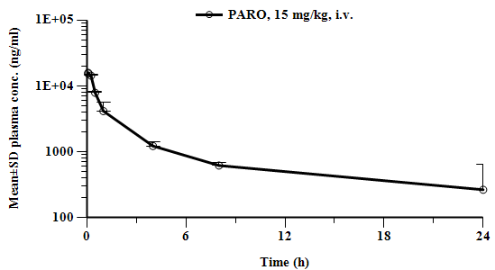 Fig. 3: Mean plasma concentration vs. time following a single dose intravenous administration of PARO in male BALB/c mice