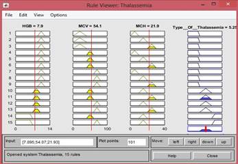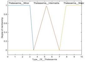 The output will be a value within the range [0, 10]. The value, 0, means that no Thalassemia problems exist as of yet. We have divided this range into smaller fuzzy sets to make a cluster of the type of Thalassemia disease. ‘Thalassemia_Minor’ is given to those patients whose output value is in between 0 and 3.4 ‘Thalassemia_Intermedia’ is given to the patients who gets a value between 3.5 and 7 also ‘Thalassemia_Major’ is given to the patients who gets a value between 7.1 and 9.9 and so on as shown in the table 5, The basic relationship is that the higher the severity of Thalassemia disease, the lower the output value.
