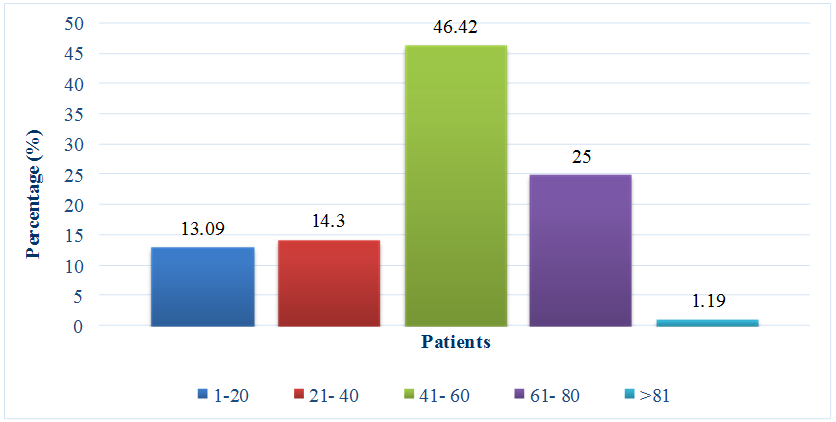 In the study which was conducted among 84 patients, the age group between 41-60 y were found to be given more number of NSAIDs (46.42 %) to 39 patients than others like 61-80 y (25 %) 21 patients, 21-40 y (14.3 %) 12 patients, 1-20 y (13.09 %) 11 patients and the least number of NSAIDs were given to the age group more than 81 y (1.19 %) which was 1 patient. So the NSAIDs are most likely prescribed to geriatric patients and less in pediatric and adolescent age groups.