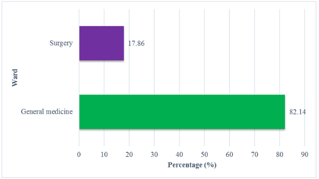 Among 84 patients, we observed that majority of the patients were admitted to the general medicine ward (82.14 %) 69 in number, rather than in surgery ward (17.86 %) 15 in number.