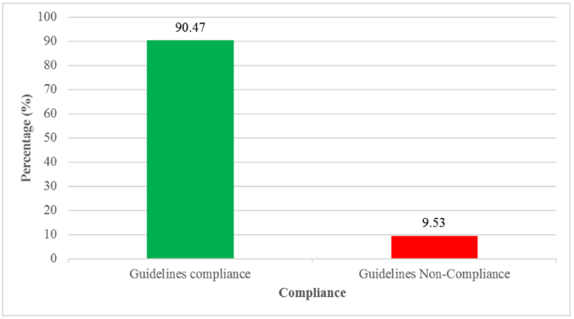 Guidelines compliance for this study was revealed to be (90.47 %) 76 in number and the prescribed NSAIDs Non-compliance was found to be (9.53 %) 8 in number.