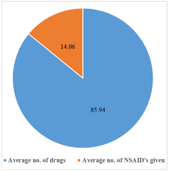 The average number of drugs given to a single patient according to the information collected from the study sample size was found to be (85.94 %) 11.36 drugs per patient approximately. And the average number of NSAIDs prescribed from the study sample size was found to be (14.06 %) 1.86 drugs per patient approximately.