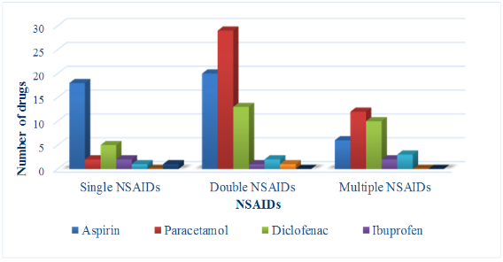 The frequency of prescribing NSAIDs was grouped into three different sets, the single NSAIDs (22.66 %) was to found to be 29 prescribed drugs, the double NSAIDs (51.56 %) was found to be 66 prescribed drugs, the multiple NSAIDs (25.78 %) was found to be 33 prescribed drugs.