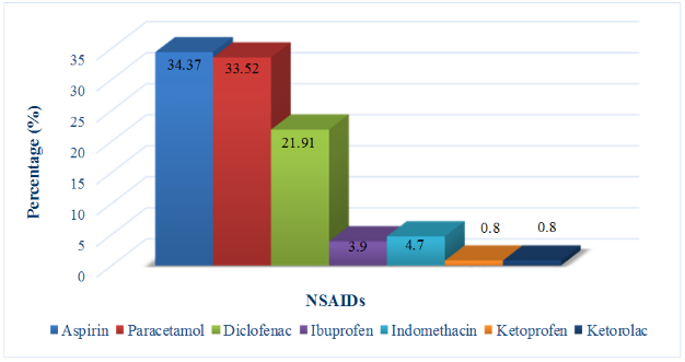 The distribution of individual NSAIDs was found to be in percentage vs. NSAIDs, where the drug Aspirin (34.37 %)was given for 44 number of patients as a peak value, Paracetamol (33.52 %) 43 number of patients being the second largest. Diclofenac (21.91 %) 28 number of patients-third largest. Ibuprofen (3.9 %) 5 number of patients. Indomethacin (4.7 %) 6 number of patients. Ketoprofen (0.8 %) 1 number of patient. Ketorolac (0.8 %) 1 number of patient.