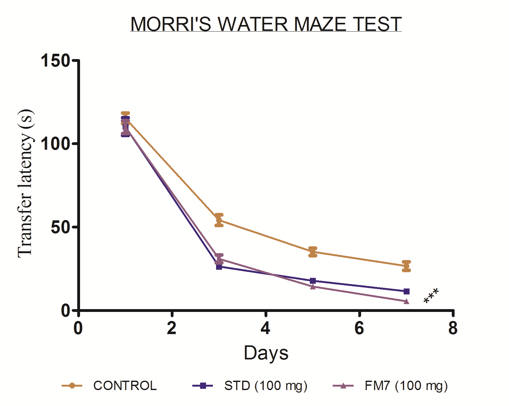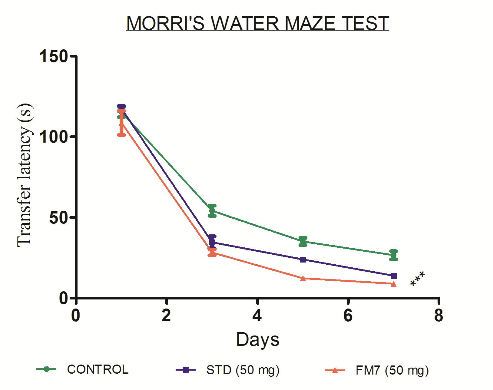 In MWM test observed that test group animal treated with 50 mg and 100 mg dose p. o of FM7 showed less transfer latency time (in seconds) during the study and found to be an extremely significant (p<0.001) when compared to control groups and much better than Bacopa monnieri for its nootropic action. In an Elevated plus maze test nootropic agent FM7 at 50 mg and 100 mg dose showed a decrease in transfer latency on the second day when compared to control and standard groups indicating significant (p<0.001) memory improvement. In another test model like pole climbing test revealed that the test group treated with FM7 (50 mg doses p. o) found to be statistically significant (p<0.001) compared to the control groups, while FM7 found that comparatively better than standard group.