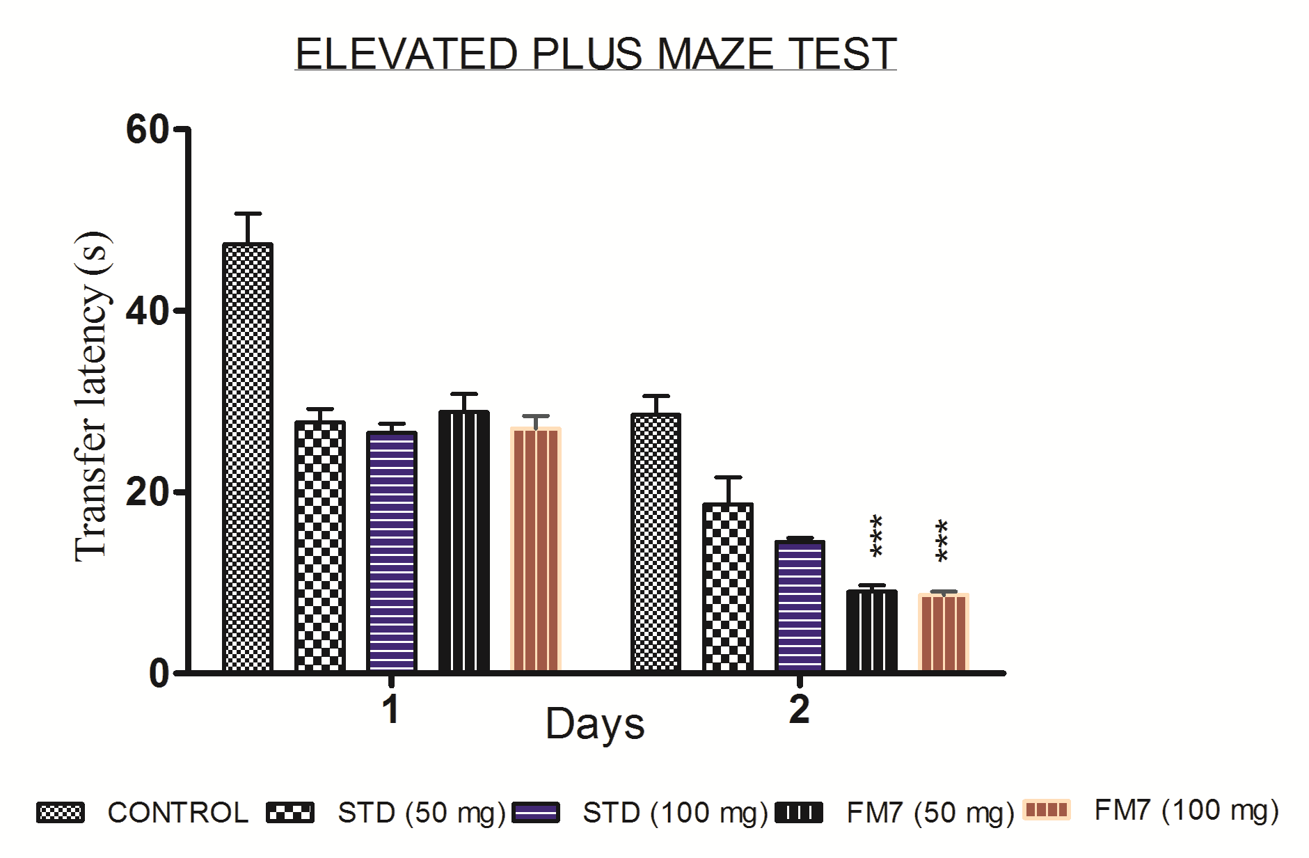 Transfer latency was defined as the time (in seconds) taken by the animal to move from the open arm into one of the covered arms with all its four legs. A little modification has been made that an opposite gender of rat is placed in any one of the covered places to observe retentive memory of all group of animals tested for whether it come faster toward that area where a different sex of animal kept. A significant decrease in transfer latency (TL), the value of retention, indicated improving memory. Test formulation FM7 at 50 mg and 100 mg dose showed a decrease in TL on the second day when compared to control groups indicating significant (p<0.001) memory improvement (fig. 2). FM7 observed better than Standard drug in improving learning and memory.