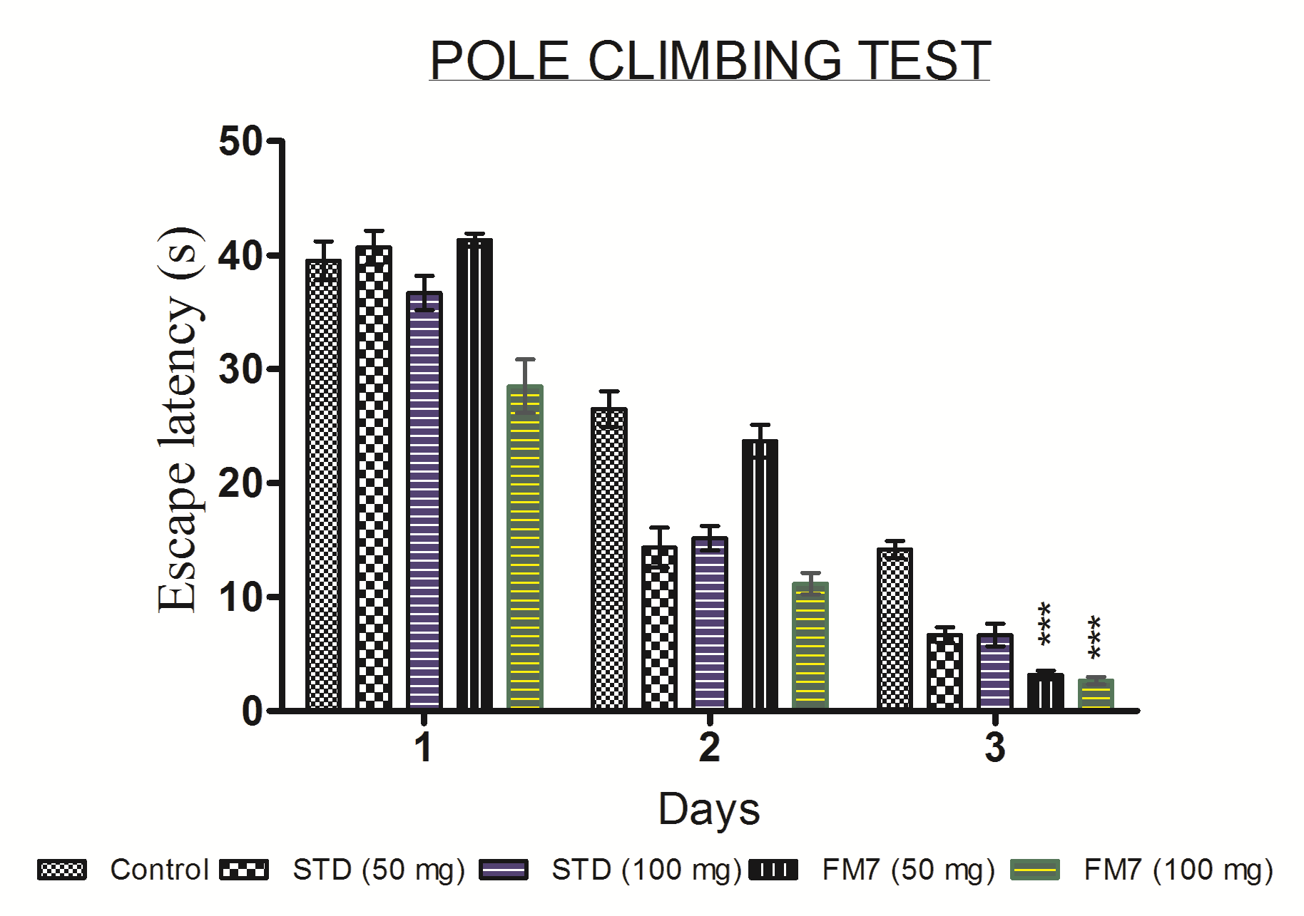 The Test group FM7 at 50 mg doses revealed a statistically significant (p<0.01) and at 100 mg dose highly significantly (p<0.001) decrease in escape latency in pole climbing test as compared to the control and standard group (Bacopa monnieri) treated group (fig. 3).