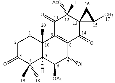 Plectranthus grandis (Cramer) Willens is a shrub popularly known in Brazil by the names of “boldo grande” [1] and this species is able to flourish in the Northeast in the mountain regions, coastal or central hinterland, as different from other species of the same genus that require milder weather or tempered to develop [2]. This plant is widely used by the population in fighting dyspepsia [3]. Still little is known about its chemical composition, but the barbatusin is a constituent identified in P. grandis which has pharmacological importance [4]. Barbatusin (9'-(acetyloxy)-10'-hydroxy-3,4'b,8',8'-tetramethyl-1',4',7'-trioxo-3',4',4'b,5',6',7',8',8'a,9',10'-decahydro-1'H-spiro[cyclopropane-1,2'-phenanthrene]-3'-yl acetate), (fig. 1), is a tetracyclic diterpene abietane found in the Plectranthus genus and two activities are reported, gastroprotective activity [5] and cytotoxic activity [6] for this compound being very promising for future pharmacological studies.