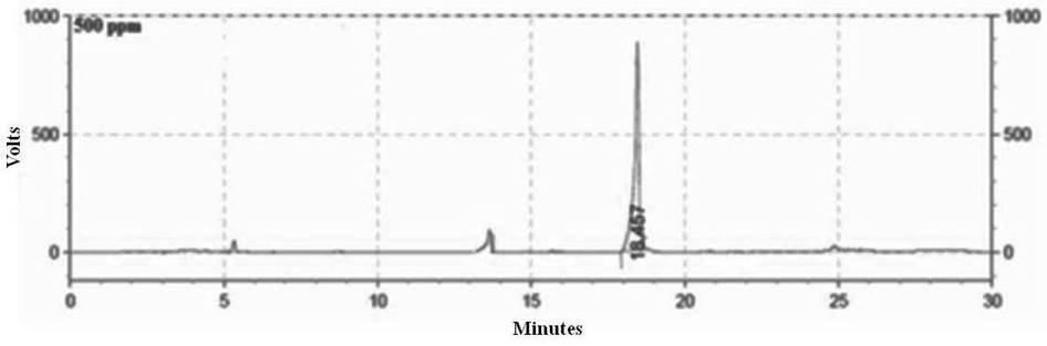 The precision of the method was assessed by repeatability (interday and intraday precision), injecting the standard in triplicate in three different concentrations (25, 100 and 500 µg. ml-1), registering the values of the areas of the chromatographic peaks and calculating the standard deviation of the determinations.