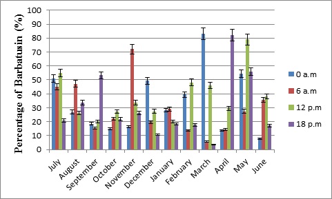 Fig. 4: Variation circadian and seasonal of barbatusin contents in the Plectranthus grandis (n=3)