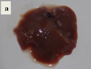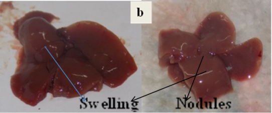 Fig. 1: Mouse liver photographs (a) Normal control mice (b) N-Nitrosodibuytlamine (DBN) treated mice. Swelling and nodules were observed in the liver excised from DBN treated mice