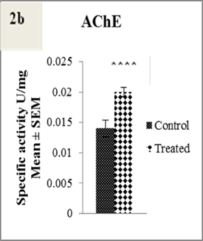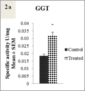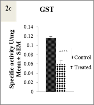Fig. 2: 2a Gamma-glutamyl transpeptidase (GGT) activity assay. The values in the bars are expressed as mean±SEM; n=10. *p˂0.025 when control was compared to treated. 2b Acetylcholine esterase (AChE) activity assay. The values in the bars are expressed as mean±SEM; n=10. ****p˂0.0001 when control was compared to treated. 2c Glutathione S-transferase (GST) activity assay. The values in the bars are expressed as mean±SEM; n=10. ****p˂0.0001 when control was compared to treated