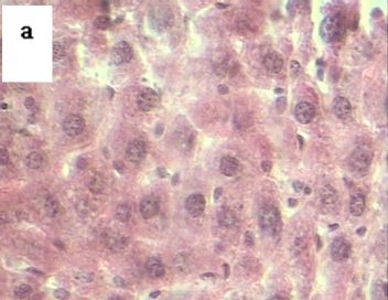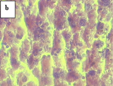 Fig. 3: Microphotographs of the histological section at 40x of liver from (a) normal control mice and (b) N-Nitrosodibutylamine (DBN) treated mice showing distorted and multinucleated cells. The slides were stained with hematoxylin and eosin. Slides were examined microscopically after drying