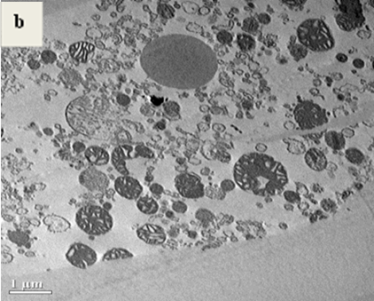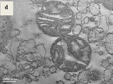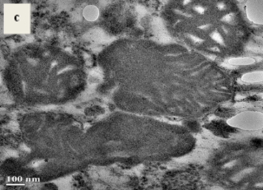 The inner and outer membrane of the mitochondria was found to be disrupted, and most of the mitochondria were condensed. They were found to have larger vacuoles whereas the mitochondria in control mice showed no such changes. They had well-defined membrane along with normal vacuoles.