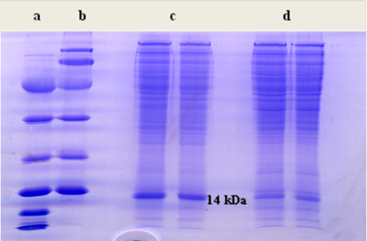 Fig. 6: SDS-PAGE analysis of the extracted mitochondrial membrane surface protein obtained from N-Nitrosodibutylamine (DBN) treated mice and normal control mice. A gel consisting of 15% (w/v) acrylamide was used for running the sample. Gel was stained using Coomassie blue and destained with methanol, acetic acid and water (4:1:5). Lane (a) Low weight molecular marker, Lane (b) Medium weight molecular marker, Lane (c) DBN treated extract and Lane (d) Normal control mice. A protein of approximately 14 kDa was seen to be overexpressed in the lane 3 containing DBN treated extract
