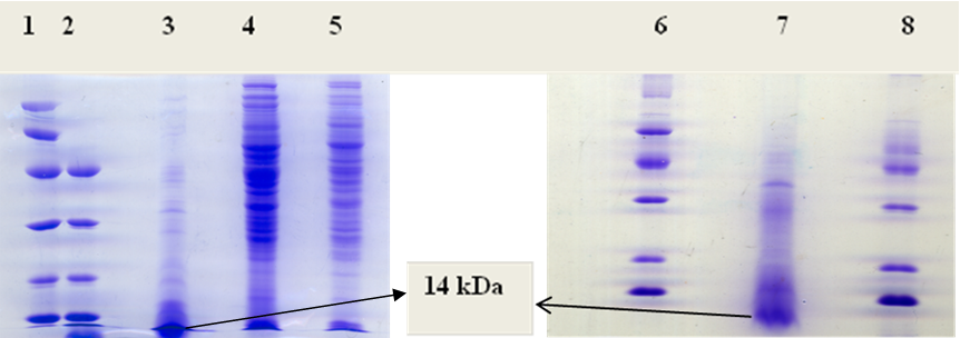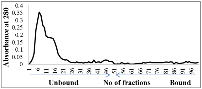SDS-PAGE analysis confirmed that the protein of interest was eluted out in unbound fraction shown in (fig 8). The protein was therefore confirmed to be anionic in character. A prominent band was observed in the lane loaded with the fractions of the unbound region. The identified band of protein was approximately found to be of 14 kDa, which was found to absent in the bound fractions region of the elution profile.