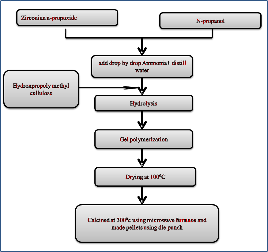 The entire precursor was taken of AR grade (99.99% pure) procured from SD fine scientific which included Zirconium n-propoxide, n-propanol, Hydroxypropyl methyl cellulose, and ammonia. The ZrO2 nanomaterial was synthesized using the method described by Heshmatpour et al. [4] with some modifications. Initially, n-propanol was added to Zirconium n-propoxide (70 wt %). Then resulting solution was hydrolysed using drop by drop addition of ammonia and distilled water with a pH value of 9 to 10. Hydroxypropyl methyl cellulose (3 g) was added to the solution under vigorous stirring. After homogenization, the solution was stirred at room temperature for an hour, so the resulting gel was polymerized. The gel was dried in an oven at a temperature of 100 °C for 12 h and sintered by using microwave furnace at 300 °C for 2 h. The resulting powders were then compacted into the mold and made pellets with the help of die and punch in a hydraulic dry press at a load of 4 Ton for 10 min with a diameter of 10 mm and thickness of 2 mm. Each pellet consists of 0.25 g powder without any binder added and given the name P1, P2, and P3. The flow chart of Sol-gel synthesized zirconia as shown in fig 1.