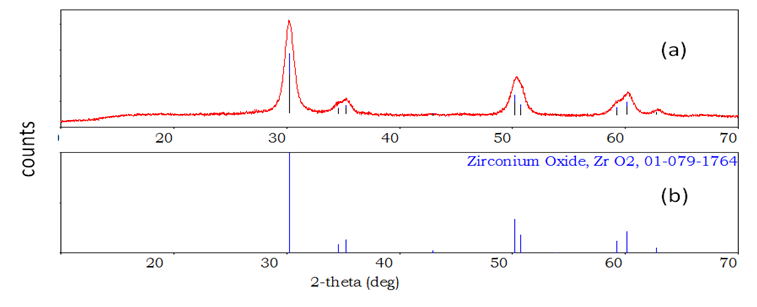 Fig. 2: (a) XRD patterns of ZrO2 sintered at 300 °C and (b) standard ICDD file of ZrO2