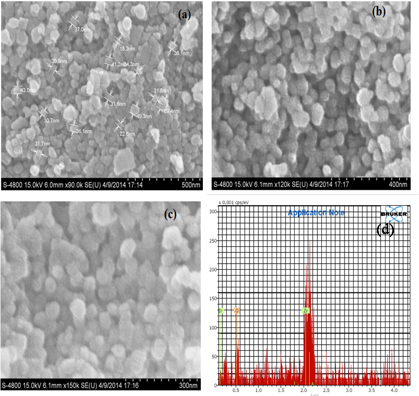 Field Effect scanning Electron Microscope (FESEM) is well known and reliable technique to analyze nanoscale samples. It gives surface morphology of samples. The FESEM image of ZrO2 fig. 3(a-c) at different magnification shows a uniform distribution of particles and spherical like morphology. The image 3(a) shows the particles in the range of 35-69 nm. The formation and composition of crystalline of ZrO2 nanoparticles are confirmed from EDX analysis, fig. 3 (d) which reveals that the Zr and O as the only elements in the sample, high purity and no any other impurity in the sample.