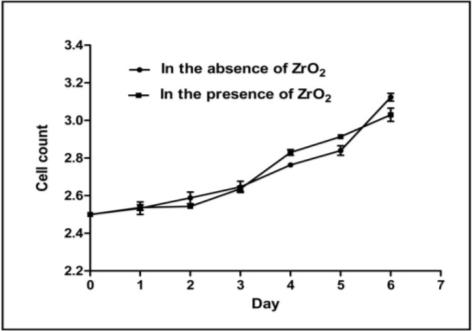 Cells growth and morphological characterization for ZrO2 pellets were studied. The fig.5 shows cells growth in the presence of nanocrystalline ZrO2 pellets along with control (in the absence of pellets). The growth of cells was measured using hemocytometer for day 1 to 6. This shows that the growth of cells along with pellets of ZrO2 is similar to that of control. It means that nanocrystalline ZrO2 powder does not show any sign of cytotoxicity. fig 6(a-c) shows images of 3T3 fibroblast cells near ZrO2 pellets which show that after 2 d the growth of cells was found in control as well as in the presence of nanocrystalline ZrO2 pellets. After 6 d the cell growth was found to be higher as compared to 2 d which indicates that nanocrystalline ZrO2 pellets did not cause any toxic effect on cells. Fig. 6 shows a regular pattern of cell growth of fibroblast cells which is characteristic of a test conducted on ZrO2 pellets. The in vitro study conducted on cytotoxicity of ZrO2 shows very high biocompatibility of materials produced. Nanocrystalline ZrO2 can be considered as non-toxic. Also, the numbers of living cells near the ZrO2 pellets were found to be increased as compared to controls (fig. 6). The present data reveals the no signs of cytotoxicity and the rate of cell growth was higher in the case of nanocrystalline ZrO2 pellets.