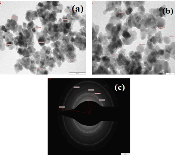 Transmission Electron Microscopy micrograph, as shown in fig. 4 (a-b), confirm the shape of particles as that of FESEM image of fig 3(a-c), with average particles size 5.84 nm which is good agreement with the one calculated by Scherrer formula. The selected area electron diffraction (SAED) pattern in fig. 4 (c) shows the concentric rings of crysatalline planes.