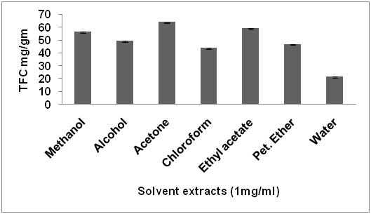 Fig. 1: Effect of various solvents on the total flavonoid content from G. gummifera gum resin. Error bars indicate SD for n=3