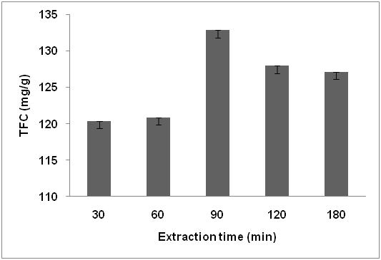 The TFC depends on extraction process and parameters used. Parameters which had a major effect on TFC were selected based on preliminary experiments. It is reported that TFC is affected by solvent concentration, extraction temperature, extraction time and hence these parameters were screened by single factor experiment [10].