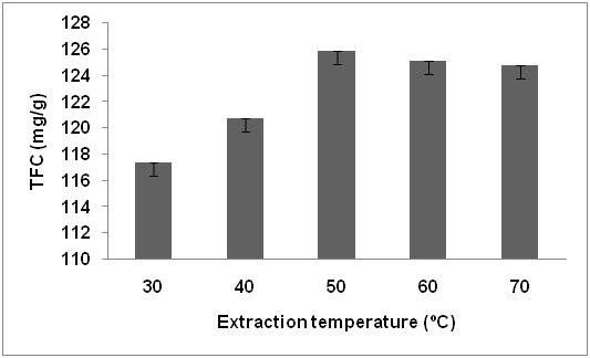 Under the above optimal conditions of acetone concentration 40% v/v and extraction time 90 min, effects of different extraction temperatures (30 °, 40 °, 50 °, 60 °, 70 °C) on the TFC were determined.