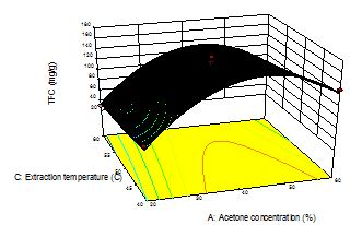Regression coefficients (R2, Adj. and Pred. R2) and corresponding P-values are also presented in table 3. From the P-values of each model term, it was concluded that the independent variables studied (A, C), quadratic terms A2 significantly affected the total flavonoid yield. The results of the study represent that acetone concentration and temperature are the most significant parameters which affect the TFC.