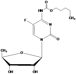 Capecitabine (CTB) (fig. 1) is a fluoropyrimidine carbamate with antineoplastic activity, and it belongs to a class of drugs known as antimetabolites. It is a chemotherapeutic agent administered orally which is used in the treatment of metastatic breast and colorectal cancers. CTB is a prodrug of 5’-deoxy-5-fluorouridine (5'-DFUR), which is enzymatically converted to 5-fluorouracil in the tumor, where it inhibits DNA synthesis and slows the growth of tumor tissue. The activation of CTB follows a pathway with three enzymatic steps and two intermediary metabolites, 5'-deoxy-5-fluorocytidine (5'-DFCR) and 5'-deoxy-5-fluorouridine (5'-DFUR), to form 5-fluorouracil. Chemically it is 5'-deoxy-5-fluoro-N-[(pentyloxy) carbonyl]-cytidine with empirical formula of C15H22FN3O6 and the molecular weight of 359.35 g/moL [1-5].