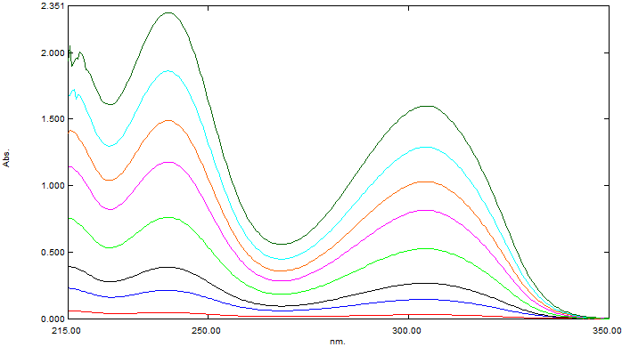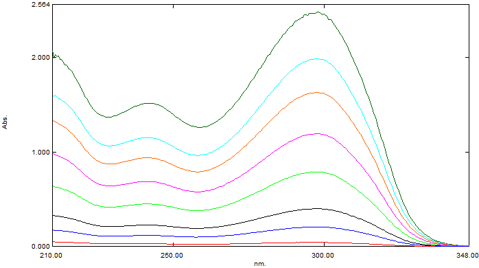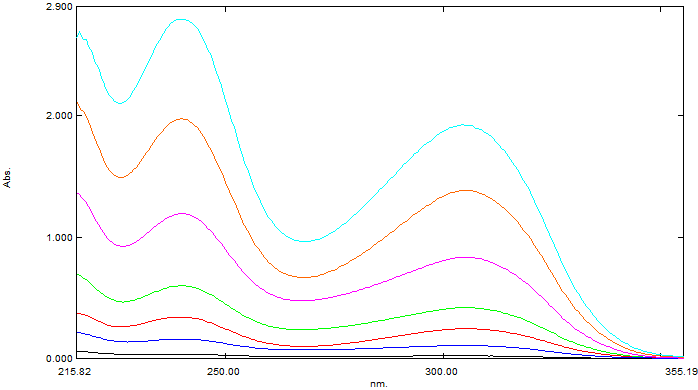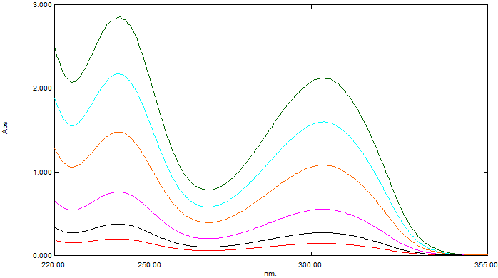 A double beam UV-VIS spectrophotometer (UV-1800, Shimadzu) loaded with spectra manager software UV Probe was employed with a spectral bandwidth of 1 nm and wavelength accuracy of ±0.3 nm with a pair of 10 mm matched quartz cells. The wavelength range of 200 nm to 400 nm was selected for scanning with medium scanning speed.