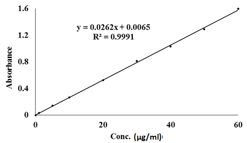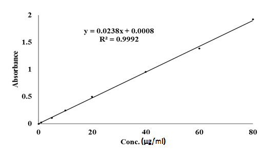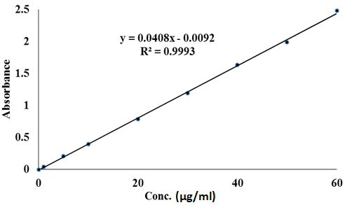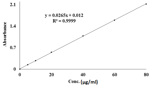 The intra-day and inter-day precision of the method were calculated at three different concentration levels (10, 50 and 100 µg/ml) and on three different days respectively and the % RSD was calculated. The accuracy of the assay method was calculated at three different levels (80, 100 and 120%), and the percentage recoveries were calculated [25].
